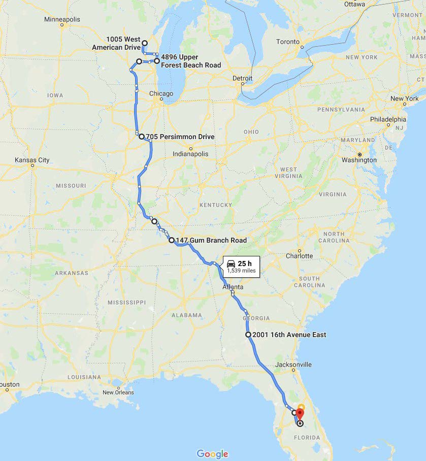 July 14, 2019: The duo was up a bit later than usual, but then again, they did cover over 500 miles the previous day and only had a bit more to go before arriving in the now not so distant land of Florida. The day was hot, very hot, so much so that the duo made more frequent stops to make sure everything was still operating fine. Finally, on one stop Little Red saw a sign in front of her: “Florida Welcomes You”. The duo had parked her a little bit far away from other vehicles so that they could stretch their legs. Little Red saw people posing under this “Florida Welcomes You” sign as others took pictures. Then it happened, she heard someone say: “oh, mommy look at that car”, then others “holy shit, that car is from Wisconsin, judging from the road grime I bet they drove it from there”. Pretty soon some people were no longer posing by the sign, but by her. She knew she had some “road grime” on her, but she tried to look her best. After about an hour the duo gets back, answers any questions that people had, and verified that yes, they were driving the car from Wisconsin and that she had not given them any problems. The young man reiterated that the weak point in the trip was not Little Red, but instead the drivers as they needed to stop to cool down, Little Red was perfect. Little Red was happy at the compliment but also a little sad as she now knew she was in the land that initially was so far away, she knew that the trip was going to end soon. A few hours after that initial stop, Little Red arrived at her new home and parked in the garage. A bit smaller than the home she remembered in Wisconsin, but a home, nonetheless.