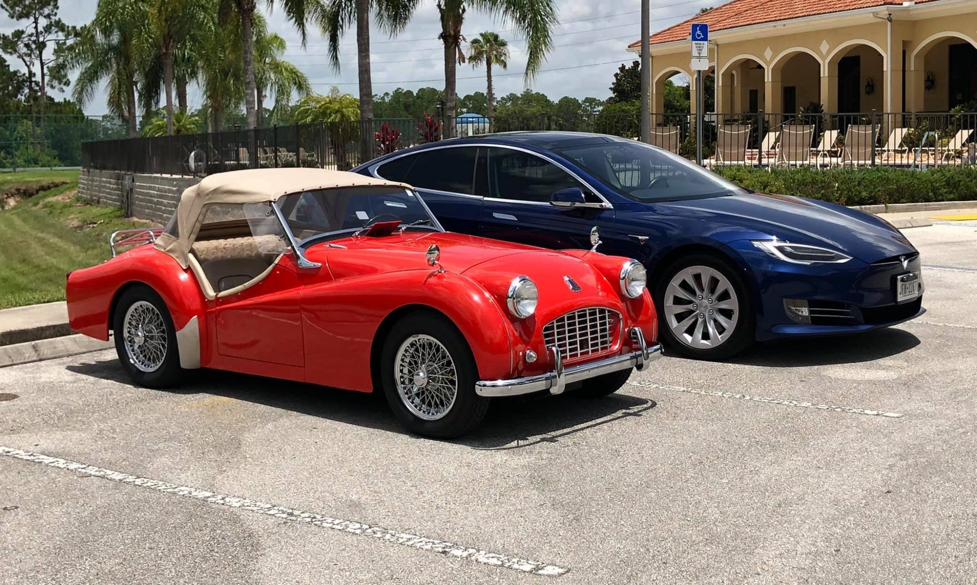 July 15, 2019: Little Red was awoken again, she knew the trip was over, but was ready to hit the road again. This time though she would have another modification done. First, she visited a large building where two police officers questioned the duo and inspected every inch of her. Then, she went to another building where the duo entered then came back out carrying a small metal rectangular object. Upon arriving back at her new home, the younger man removed her rear panel that covered her spare tire and he took it inside the house. He emerged with the panel again but gone was the blue and red license plate that she had worn for many decades and instead a light blue and white license plate was present. The young man placed the rear panel back on Little Red, then proceeded to remove the front license plate that had also been in place for several decades. Little Red had been made a resident of this land of Florida. Now with her new license plate she was backed out of the garage and the young man gave her a wash and detail. The care he took to clean everything, polish where needed, reminded her of the countless times he had done this in the past even those visits where she knew he could not drive her, he still took care of her. After the wash, something that had not been done in decades occurred. The young man removed the roof, side skirts, and prepped for top down driving. Little Red would be driven with the top down!