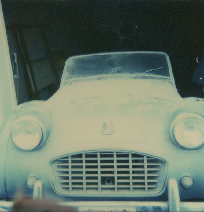 Well, Grace and I were out “bumming” again. No plans or anything and we found ourselves on County I again, fate? I think I mentioned “I wonder what ever happened to that old car that was in that barn where we got eggs that one time”. Thank God we never got eggs there again! We were just passing it and since we had our Bio-Suits with us this time, we decided to stop and see if it was still there. The farm had been sold to a William Litt and his wife and he had requested the owner of the car, a Lillian Zaun, to please remove it since it had not moved since her divorce about 15 years before. It had been a wedding present from her husband when they had married. As luck would have it, Lillian Zaun lived in Cedarburg Wisconsin about 10 miles away and he had kept her phone number which he gave to us. So, we thought, let’s give her a call and see if she still has it. So, we did. Fate happened again. She told me it was in her garage, in Cedarburg, she had just purchased a new car and needed the Triumph gone so she had room for the new car. A few days later we, Grace, our two kids, Elena and Christian stopped by her house to look at it. It still had a couple of tears in its headlights, but a tentative coy smile in the grill. Could it be, it thought, someone may want me! Lillian said she just wanted to get rid of it! We had no idea what to offer but Lillian said she would take $500 dollars, if we would get it out of her garage that weekend. It was January, cold, snowing and since our memory was starting to fail, we said yes. So, on a Saturday morning, when it was about 15 degrees outside, a friend of ours, Sergio Salinas brought a trailer to pick it up and bring it to our home in West Bend, Wisconsin.